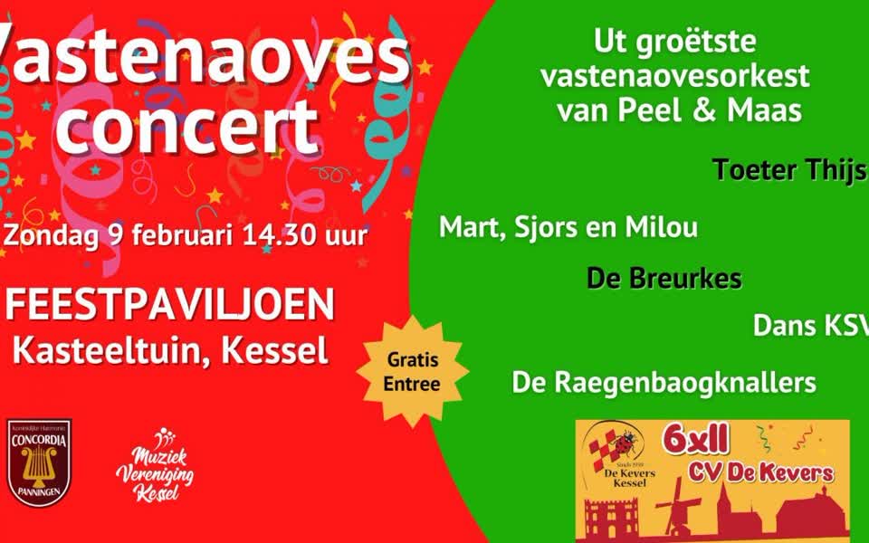 Koninklijke Fanfare Maasoever Kessel en Koninklijke Harmonie Concordia Panningen organiseren een Vastelaovesconcert mede ter ere van het 6x11 jubileum van CV De Kevers.