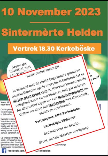 Door de vele regen van de afgelopen dagen en vandaag is het veld waar de troshoop in Helden ligt, niet bereikbaar. Kingerfiëste Helje Dörp heeft daarom besloten om geen troshoop te doen tijdens Sint Maarten.