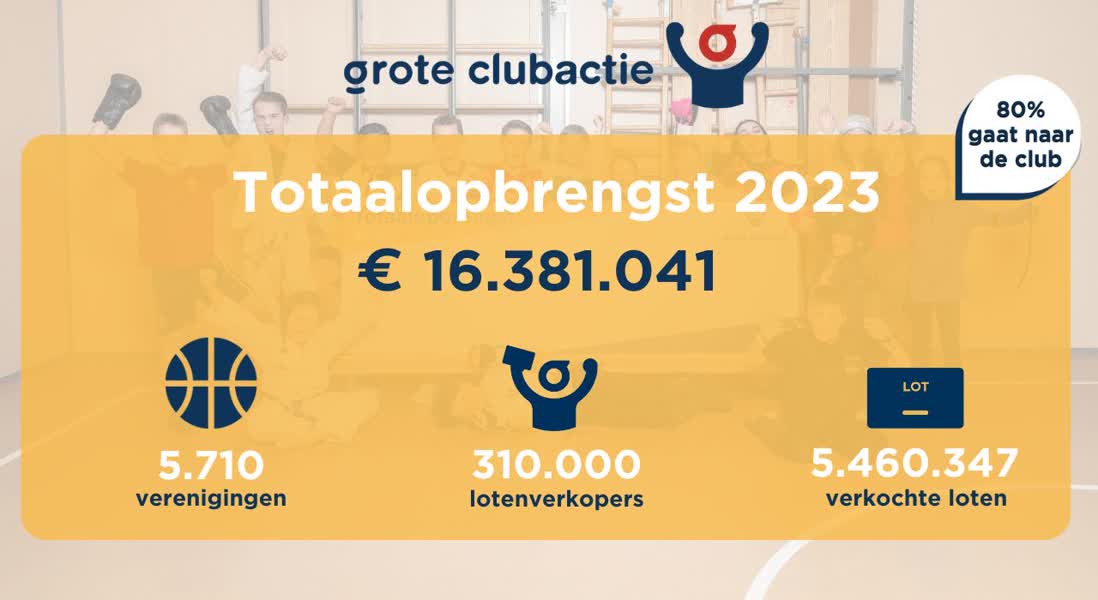 De loterij van de Grote Clubactie is al jaren de grootste fondsenwervende actie voor sport-, cultuur-, en hobbyverenigingen in Nederland. Van elk verkocht lot ter waarde van 3 euro gaat 80 procent, wat neerkomt op €2,40, naar de clubkas. Dat is het hoogste uitkeringspercentage van alle fondsenwervende loterijen.