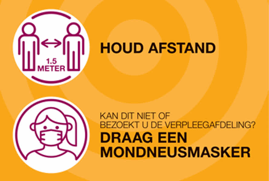 Bezoek je een patiënt op de verpleegafdeling? Dan krijg je een medisch mondneusmasker. Dit mondneusmasker draag je het gehele bezoek, ook als je bij de patiënt zit. Er zijn maximaal twee bezoekers per patiënt per dag toegestaan, alleen niet tegelijkertijd (bezoek dient elkaar af te wisselen). Doordeweeks is het bezoekmoment tussen 18.00 en 20.00 uur. Op zaterdag, zondag en feestdagen tussen 14.00 en 16.00 uur.