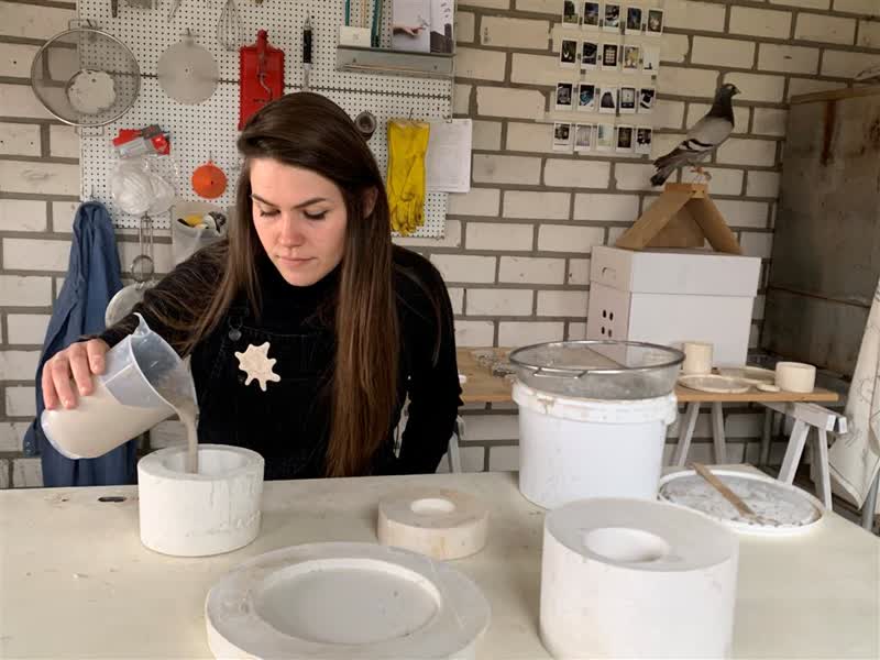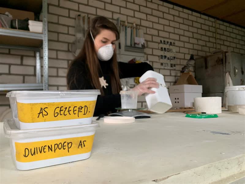 Het klinkt vies maar bleek prijswaardig: servies van duivenpoep. Het afstudeerproduct van Lotte Hendriks uit Maasbree viel in de smaak bij juryleden van de Scriptieprijs van Zuyd Hogeschool. "Ik moest lachen dat juryleden het zo leuk vonden en ik de prijs mocht ontvangen."De 25-jarige ontwerpster studeerde met haar duivenpoepservies af met een 9. Ook was ze genomineerd voor de Henriette Hustinxprijs. Dat is een prijs van 5000 euro voor studenten van de drie kunstfaculteiten van Zuyd Hogeschool die uitblinken in hun vak en beloftevol voor de toekomst zijn.Het begon allemaal met een reportage op L1. "Ik zat aan de keukentafel toen ik het verhaal voorbij hoorde komen met de kop: 'Duiven vrezen de valk'", vertelt Hendriks. In Horst bleek de kerk geterroriseerd te worden door poepende duiven. "Er was onrust tussen het kerkbestuur en de plaatselijke postduivenvereniging De Snelvliegers. Het kerkbestuur had het idee om een nestkast voor de slechtvalk op te hangen, want 90 procent van het menu van de slechtvalk bestaat uit duif. Maar dat vond de postduivenvereniging geen goed idee, want dan konden zij hun sport niet meer uitoefenen of al hun duiven werden opgevreten." De ontwerpster voelde zich geroepen om iets te doen met de ontstane onrust. "Ik wilde van het probleem een oplossing maken. Ik vroeg me af hoe ik die mannen weer bij elkaar kon krijgen. Dat is met koffie en vlaai, typisch Limburgs." En zo ontstond haar idee om een koffie- en vlaaiservies te ontwikkelen. Van duivenpoep dus. Per bord heeft ze bijvoorbeeld 15 gram duivenpoep nodig. Het duivenpoepprobleem in de kerk is inmiddels opgelost door rekken die in de kerktoren staan, waardoor de duiven hun boodschap daar niet meer achter kunnen laten. De Maasbreese heeft nu andere leveranciers gevonden die duivenpoep voor haar verzamelen. "Wat ook wel leuk is, is dat ik nooit hetzelfde bordje kan maken. Soms heb ik bijvoorbeeld kommetjes, maar dan zitten er helemaal geen mineralen en zouten uit de poep in die zorgen voor de spikkels. Dus het ligt er heel erg aan wat de duif heeft gegeten, van de grond gepikt of wat de eigenaar van een postduif hem geeft. Dat bepaalt hoe het glazuur eruit komt te zien."In haar omgeving waren de mensen in het begin huiverig over haar idee. "Veel mensen vonden het ook vies. Dat vond ik een interessante trigger om te kijken hoe ik het niet meer vies kon maken en mensen een ander beeld kon geven van duivenpoep." Om erachter te komen of gebruikers ziek worden van de verwerkte duivenpoep in het servies, heeft Hendriks een onderzoek gedaan bij een dierenarts in Horst. "Om te achterhalen of er gekke bacteriën in zitten die er niet in horen. Maar het was allemaal veilig. Ze vertelden me daar dat ik er gerust mee kan werken, als ik maar handschoenen en een mondkapje draag."Ze wil het duivenpoepservies uiteindelijk op de markt gaan brengen. Het staat al in haar eigen keukenkast. "Daardoor kan ik kijken hoe ik het gebruiksgemak nog beter kan maken. Hoe het kopje bijvoorbeeld niet te warm wordt." Of mensen uiteindelijk duivenpoepservies ook gaan kopen, is nog maar de vraag. "Ik krijg er wel al veel vragen over. Mensen zijn geïnteresseerd. Maar het blijft een beetje een dingetje bij de mensen van wil ik dit of wil ik dit niet."Een volgend project met bijvoorbeeld hondenpoep, sluit ze niet uit. "Maar ik vind het leuker als het een achterliggend verhaal heeft, zoals die verhalen van Man Bijt Hond. Gekke verhalen waar ik iets kan maken van het materiaal dat daarin een rol speelt. Zo kan ik dat verhaal erbij vertellen om de mensen daarin helemaal mee te nemen."Nu hoopt de kunstenares dat corona het snel toelaat om haar duivenpoepverhaal tot een goed einde te brengen. "Ik heb alle heren (kerkbestuur en postduivenvereniging, red.) een kaart per postduif verstuurd om ze uit te nodigen op het Lambertusplein bij de kerk. Het idee is aan een grote tafel, gedekt met het duivenpoepservies met koffie en vlaai een verbroederingsgesprek te houden. Ik krijg nu vaker de benaming van vredesduif en hoop dat zo door te kunnen zetten."