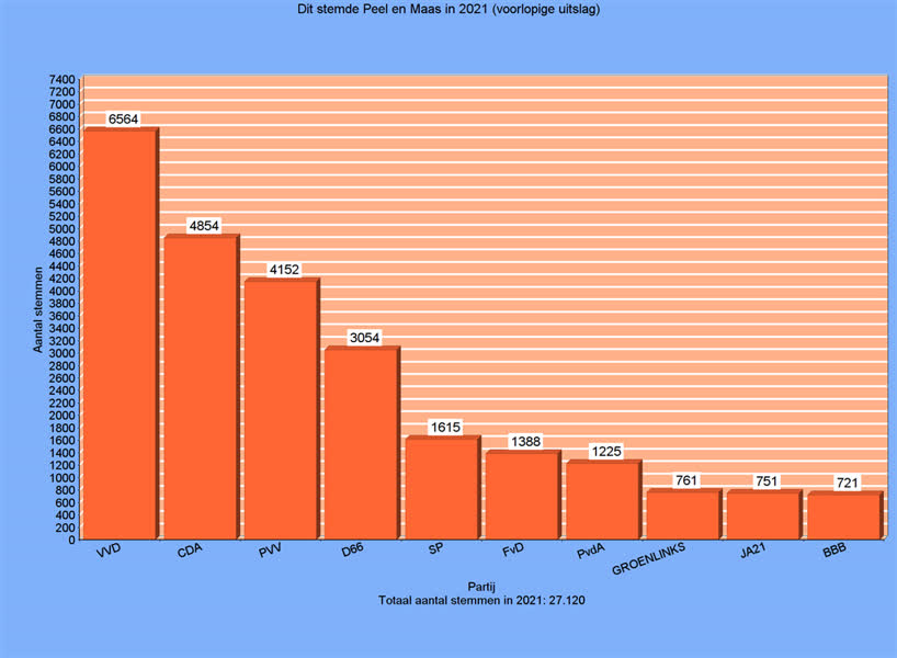 De VVD heeft de meeste stemmen gekregen van de inwoners van Peel en Maas. De partij kreeg 24,2 procent van alle stemmen. Dat blijkt uit de voorlopige uitslag.