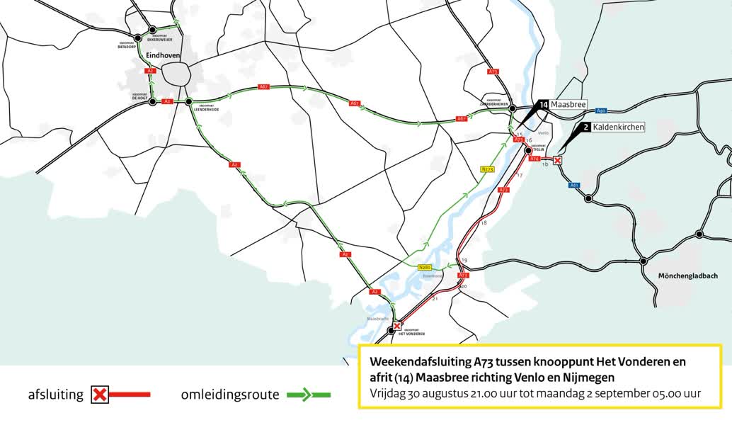 Rijkswaterstaat voert van vrijdag 30 augustus 21.00 uur tot maandag 2 september 05.00 uur onderhoudswerkzaamheden uit aan de A73. Hierdoor is de A73 afgesloten voor verkeer richting Venlo en Nijmegen tussen knooppunt Het Vonderen en afrit (14) Maasbree. Ook is de 61/A74 tussen oprit (2) Kaldenkirchen (DL) en knooppunt Tiglia afgesloten.