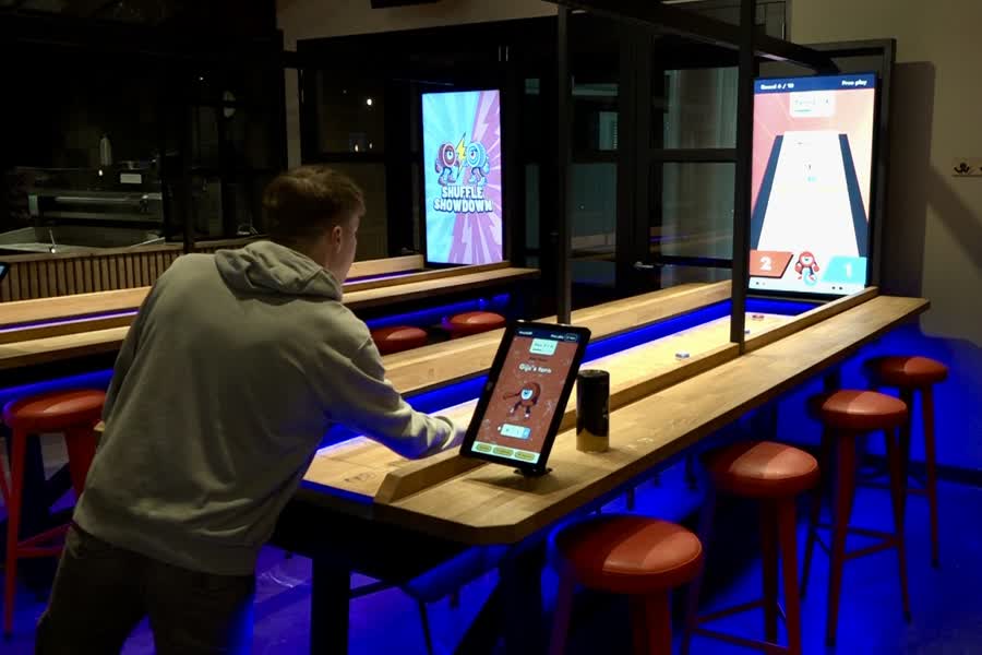 Shuffleboards zijn geschikt voor iedereen. “Eigenlijk van 10 tot 90 jaar, maar we richten ons wel op 18-plus. Het is eigenlijk een kroegspel. Drankje erbij, plezier maken met vrienden of collega's. Het is denk ik een van de weinige spellen waarbij de winkansen gelijk zijn aan elkaar. Dat maakt het heel erg leuk”, vindt Micky. Boven de shuffleboards hangt een camera die de pucks herkent. Dat is terug te zien op het scherm met de puntentelling. Om de speeltafels heen is een soort bar gemaakt waaraan de spelers met maximaal tien personen plaats kunnen nemen.