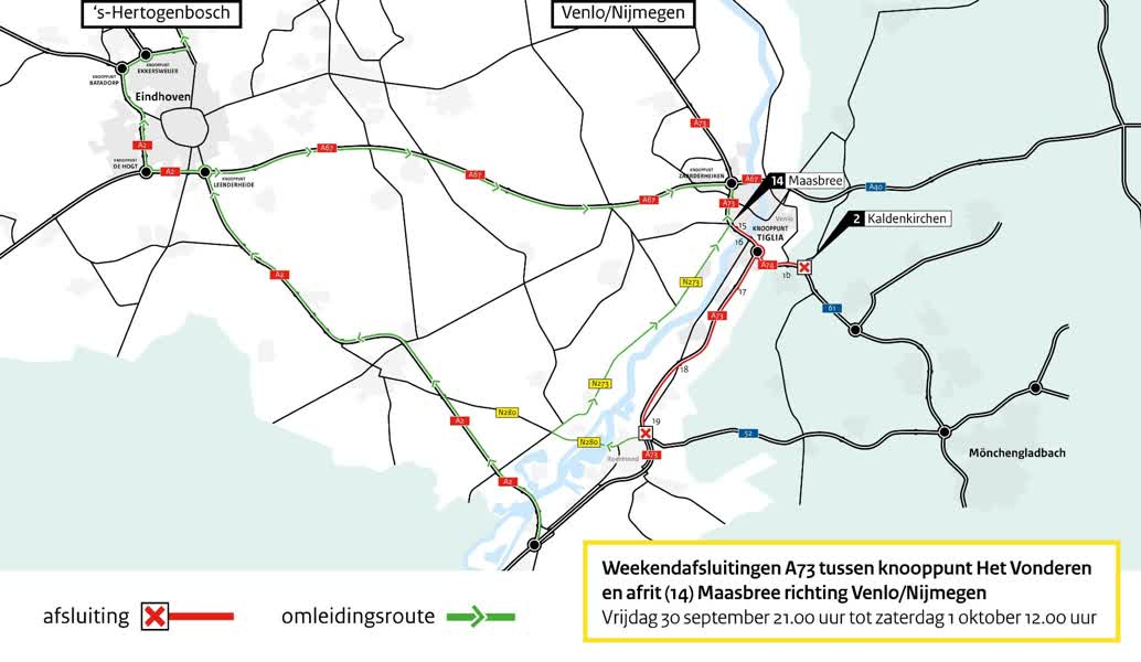 Op de snelweg A73 tussen oprit (19) Roermond en afrit (14) Maasbree richting Venlo en Nijmegen zijn van vrijdag 30 september 21.00 uur tot zaterdag 1 oktober 12.00 uur de volgende afsluitingen: