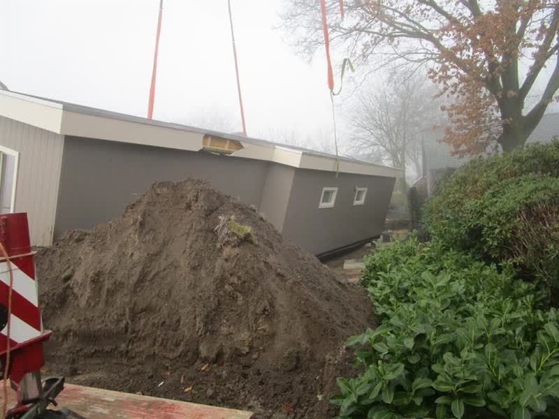 Bij de plaatsing van een woonunit op de Kempstraat in Egchel is de unit omgekiept.