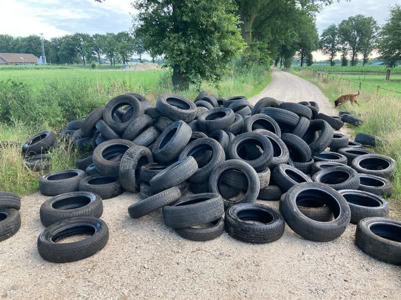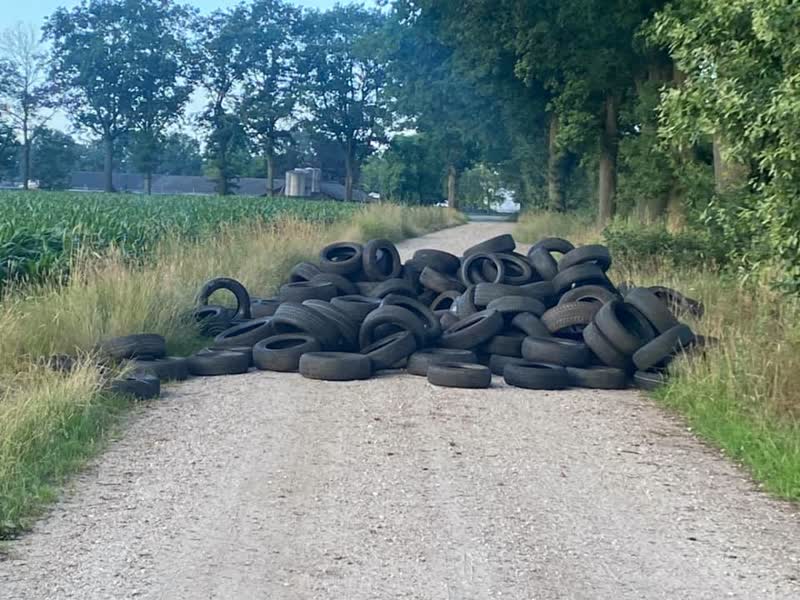 De banden zijn inmiddels van het zandpad gehaald. Het is onduidelijk wie en waarom de banden zijn gedumpt. Autobanden zonder velgen kunnen namelijk gratis naar het milieupark worden gebracht.