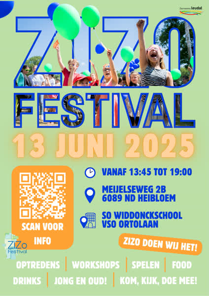 Het ZiZo-festival is door en voor kinderen/jongeren. Iedereen is van harte welkom. Het festival wordt geopend om 13.45 uur en sluit om 19.00 uur en vindt plaats op het terrein van De Widdonck, Meijelseweg 2b in Heibloem.